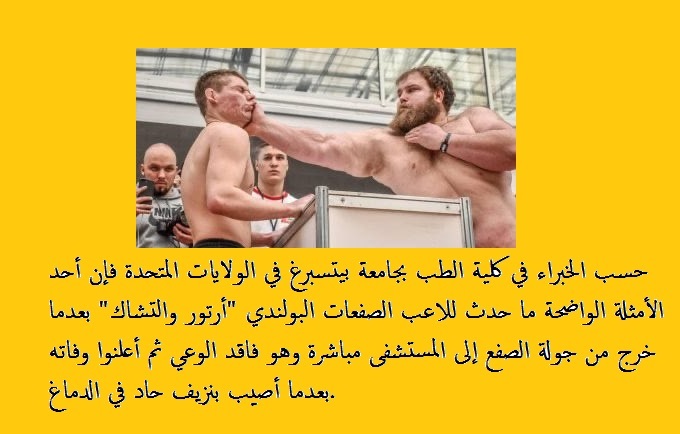 وبحسب الخبراء في كلية الطب بجامعة بيتسبرغ في الولايات المتحدة فإن أحد الأمثلة الواضحة ما حدث للاعب الصفعات البولندي “أرتور والتشاك” بعدما خرج من جولة الصفع إلى المستشفى مباشرة وهو فاقد الوعي ثم أعلنوا وفاته بعدما أصيب بنزيف حاد في الدماغ.