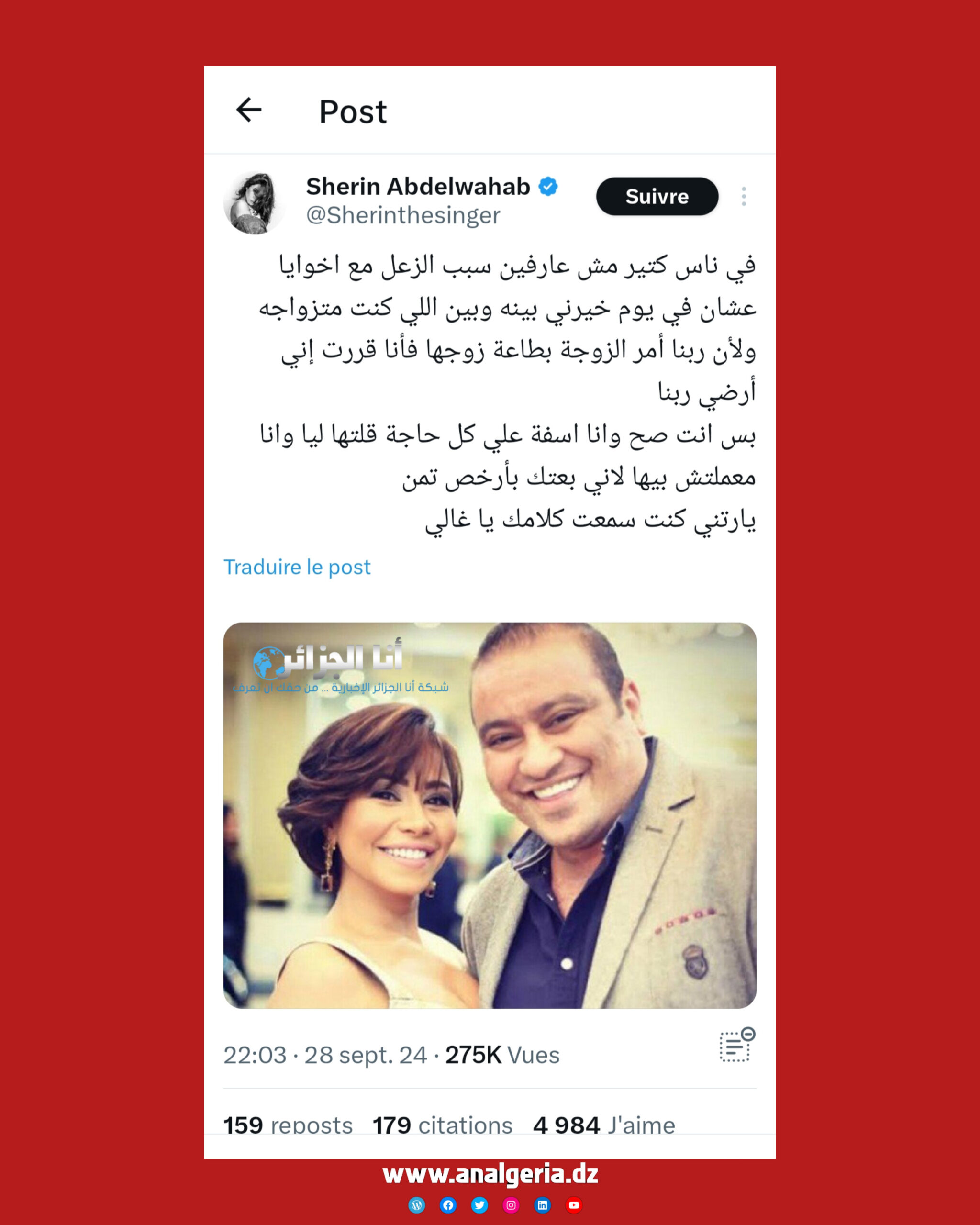 نشرت القنانة المصرية شيرين عبد الوهاب تغريدة على منصة “إكس” تويتر سابقا؛ تعبر فيها عن ندمها على عدم الأخذ بنصائح شقيقها؛ واعتذرت منه بطريقة غير مباشرة بعد الخلافات التي وقعت.