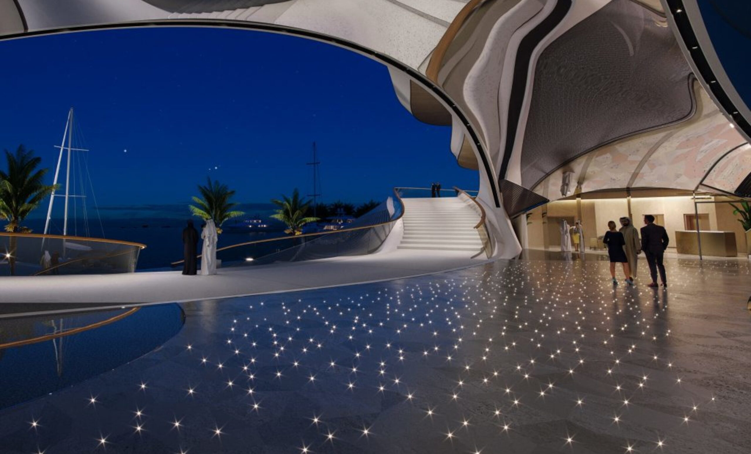 وجرى تصميم مدخل النادي على شكل قوس يٌظلل ساحة واسعة بإطلالات خلابة على البحر الأحمر، حيث تزدان هذه الفسحة بسقف مقبب وعاكس فوق أرضية مضاءة بالنجوم، مما يوفر سماء ليلية بديلة للضيوف عند المساء.