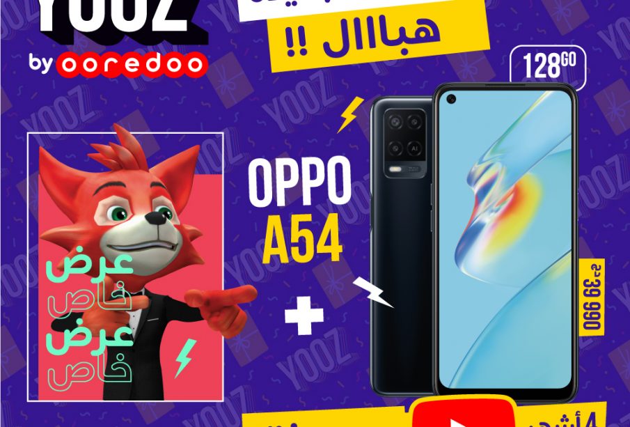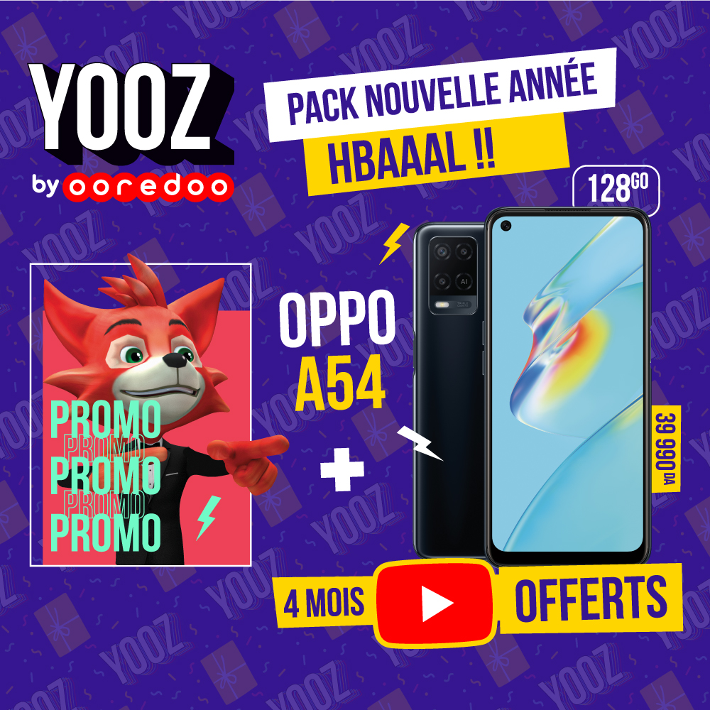 بـ 39 990 دج، يستفيد الزبون من هاتف ذكي من نوع OPPO A 54 « 128 Go » و شريحةSIM YOOZ تمنح له ولوج لمنصة اليوتيوب لمدة 4 أشهر مُهداة و فرصة الولوج خلال الشهر الأول بصفة غير محدودة للمحتوى الموسيقي الثري و المتنوع عبر التطبيق.