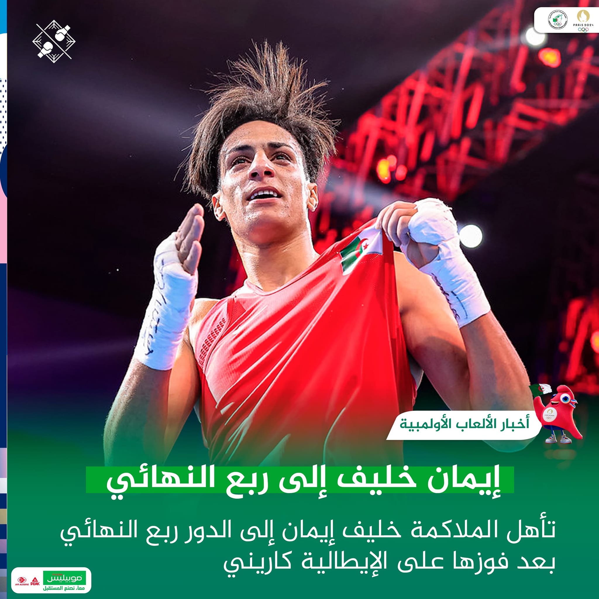 تأهلت الملاكمة الجزائرية، إيمان خليف إلى الدور ربع النهائي وزن أقل من 66 كلغ، ضمن أولمبياد باريس 2024.