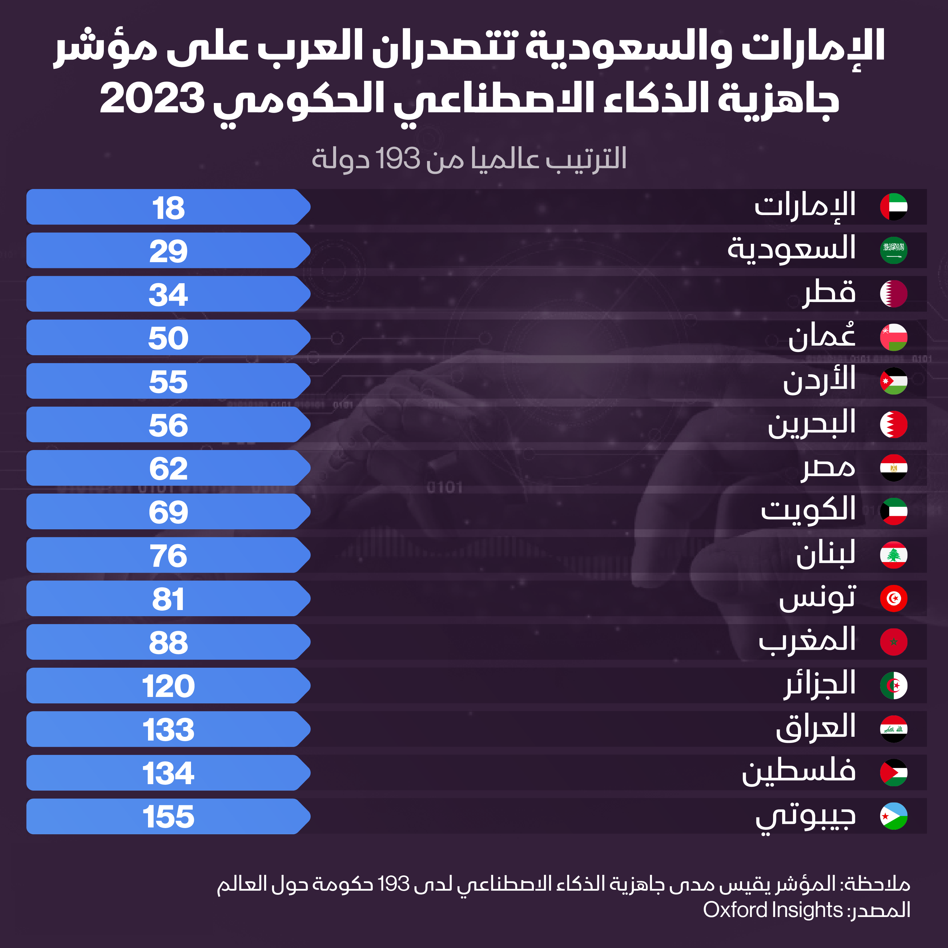 إنفوغرافيك: الإمارات والسعودية الأكثر جهوزية عربياً للذكاء الاصطناعي وهذا ترتيب الجزائر