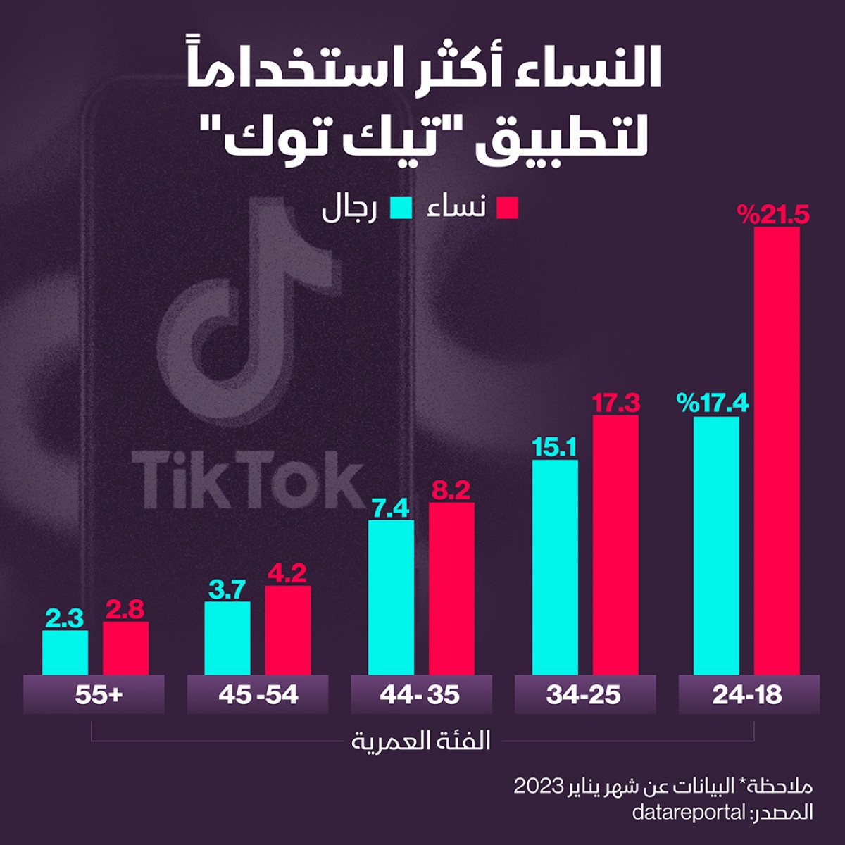 كانت النساء أكثر استخداماً لتطبيق “تيك توك” من الرجال، وبلغت النسبة الأكبر للمستخدمين في الفئة العمرية التي تتراوح بين 18 إلى 24 عاماً، حيث كانت نسبة المستخدمات لتطبيق مقاطع الفيديو الشهير في تلك الفئة 21.5%، مقابل 17.4% للرجال.