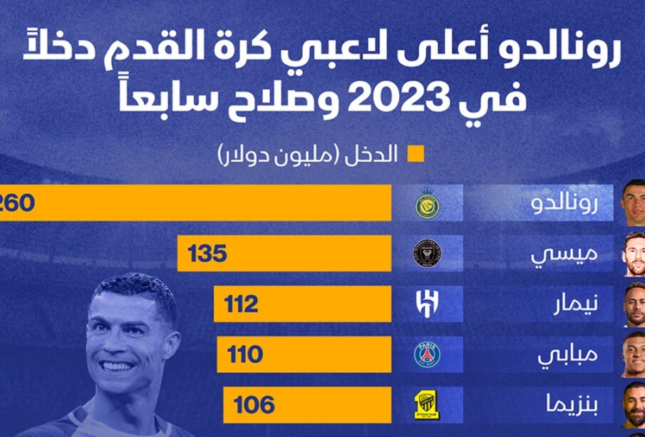 إنفوغرافيك: رونالدو يتصدر قائمة لاعبي كرة القدم الأعلى دخلاً في 2023
