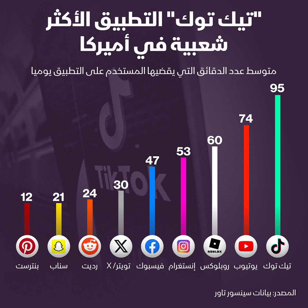 يقضي مستخدمو وسائل التواصل الاجتماعي في الولايات المتحدة نحو 95 دقيقة يومياً في المتوسط بتصفح “تيك توك”، وفق بيانات “سينسور تاور”، ما يجعله التطبيق الأكثر شعبية في البلاد.