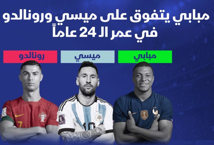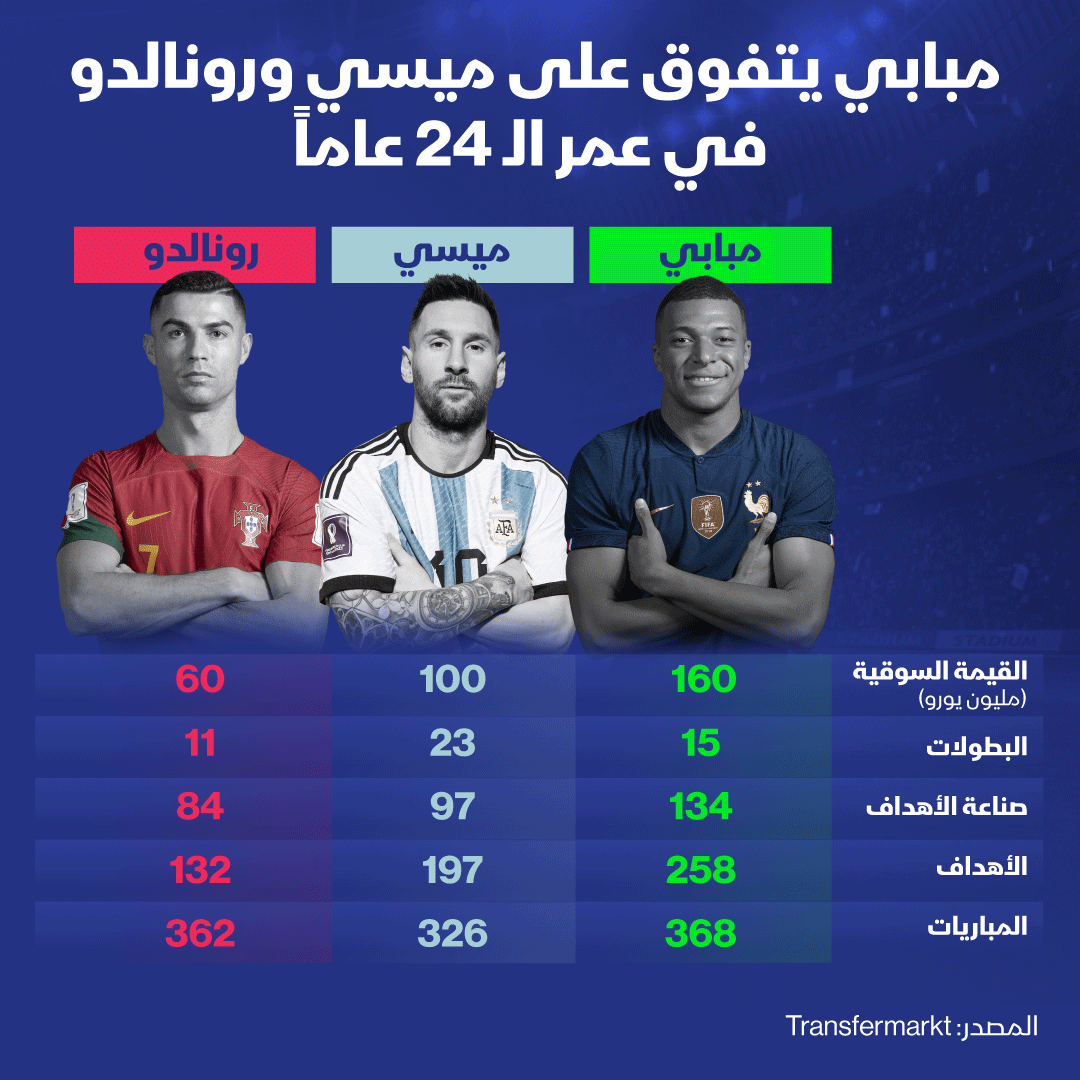 إنفوغرافيك: مبابي يتفوق على ميسي ورونالدو في عمر 24 عاماً