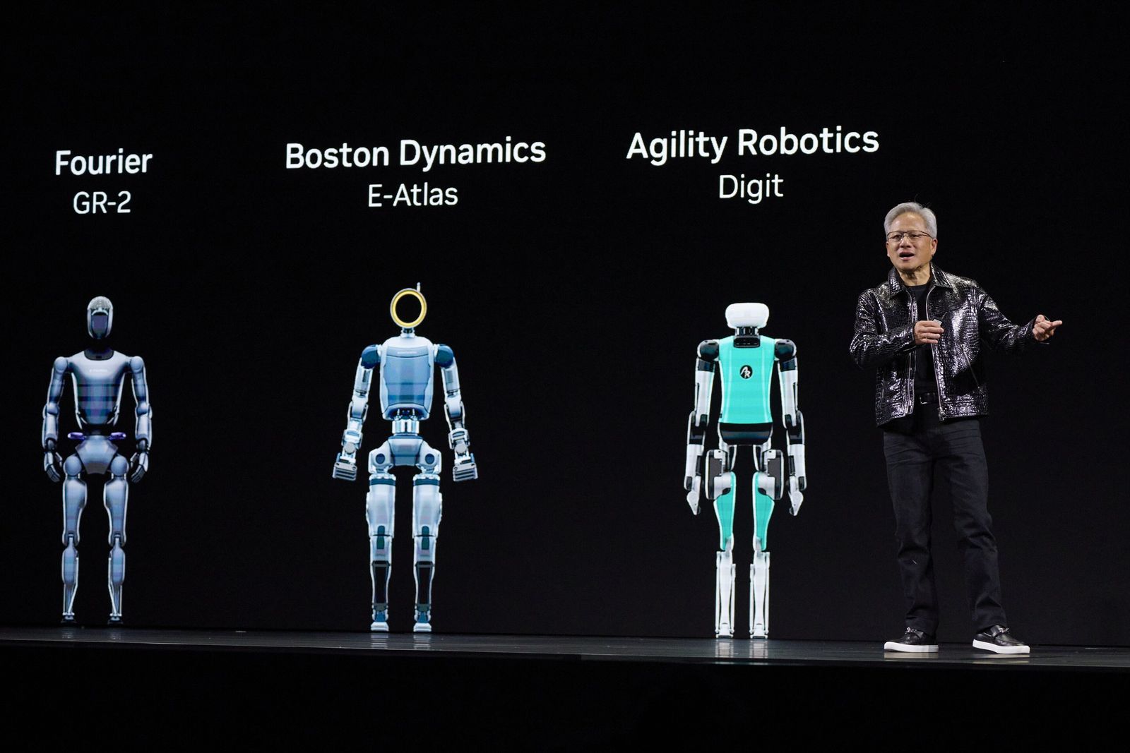 Jensen Huang, co-founder and chief executive officer of Nvidia Corp., speaks about humanoids during the 2025 CES event in Las Vegas, Nevada, US, on Monday, Jan. 6, 2025. Huang announced a raft of new chips, software and services, aiming to stay at the forefront of artificial intelligence computing. Photographer: Bridget Bennett/Bloomberg