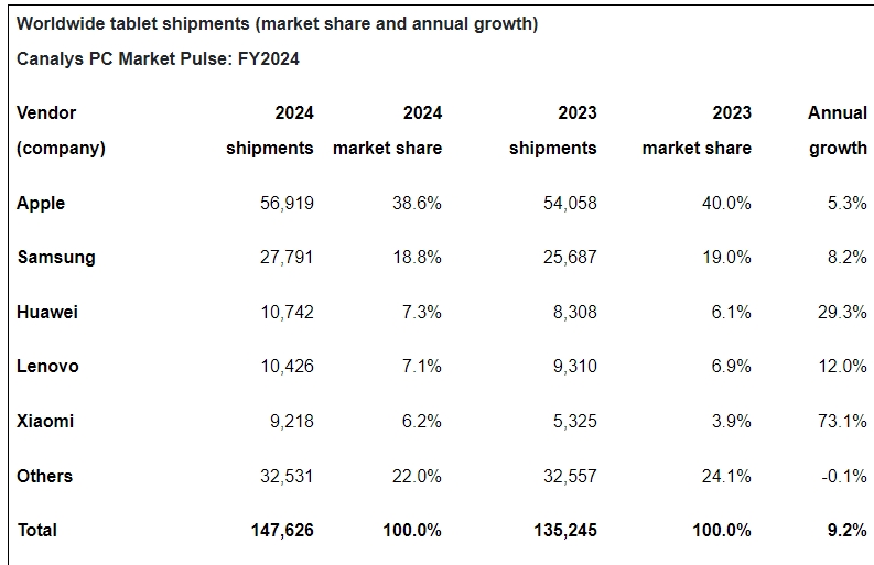 - شهد سوق الأجهزة اللوحية نمواً بنسبة 9.2% في 2024، ليكون أول توسع منذ 2016 باستثناء 2020