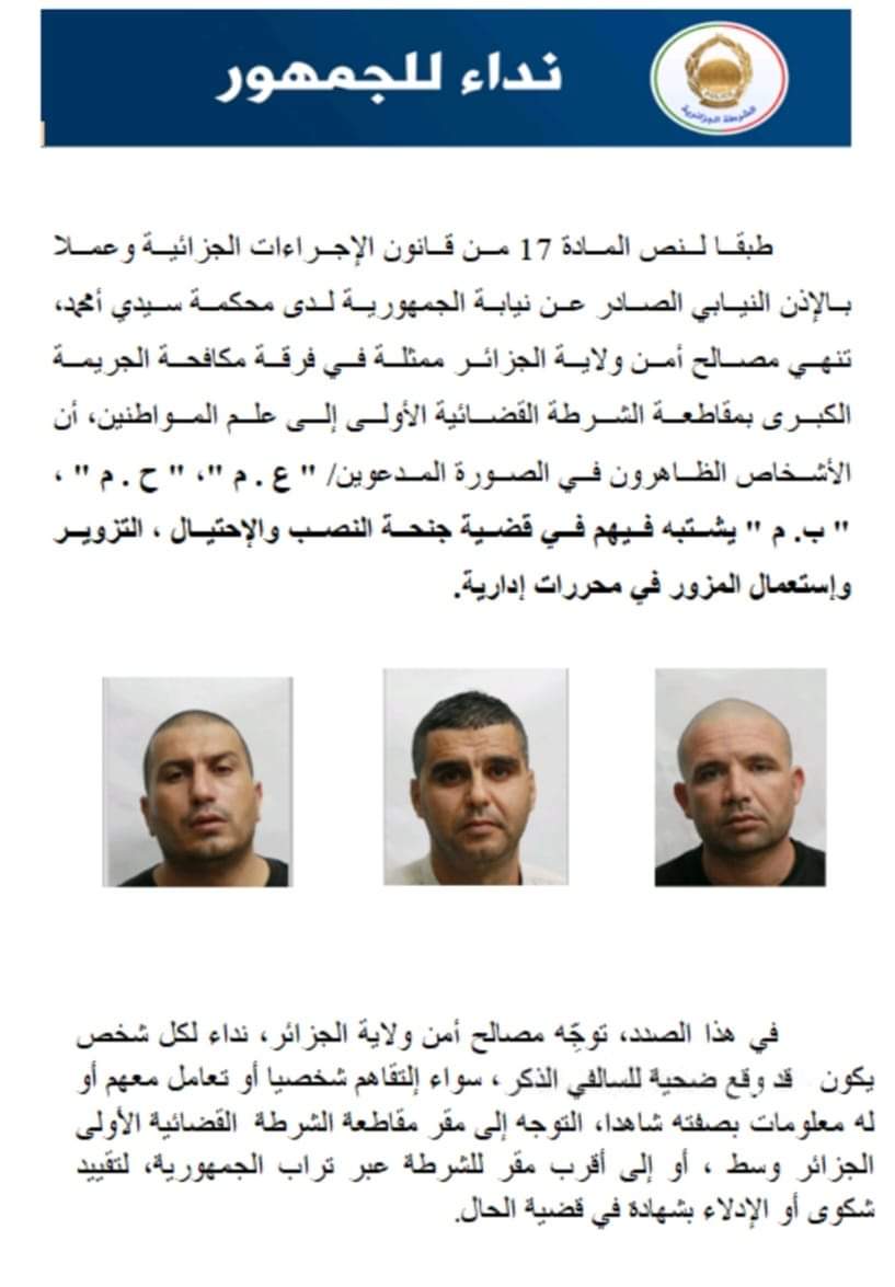 Home›الجزائر اليوم›الأمن يوجه نداء للجمهور بخصوص 3 أشخاص متورطين في قضايا نصب وإحتيال