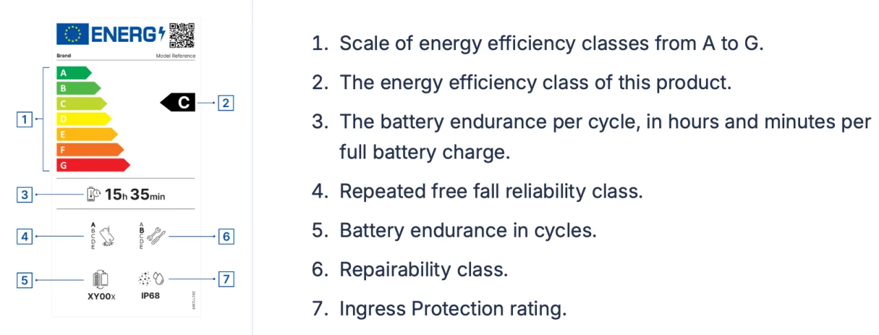 ستشمل الملصقات الجديدة تصنيفاً لكفاءة استهلاك البطارية من A (ممتاز) إلى G (ضعيف)، بالإضافة إلى معلومات عن عمر البطارية المتوقع، وعدد دورات الشحن التي يمكنها تحمّلها قبل التدهور. وللمرة الأولى، سنرى تقييماً واضحاً لمتانة الجهاز وقابليته للإصلاح.