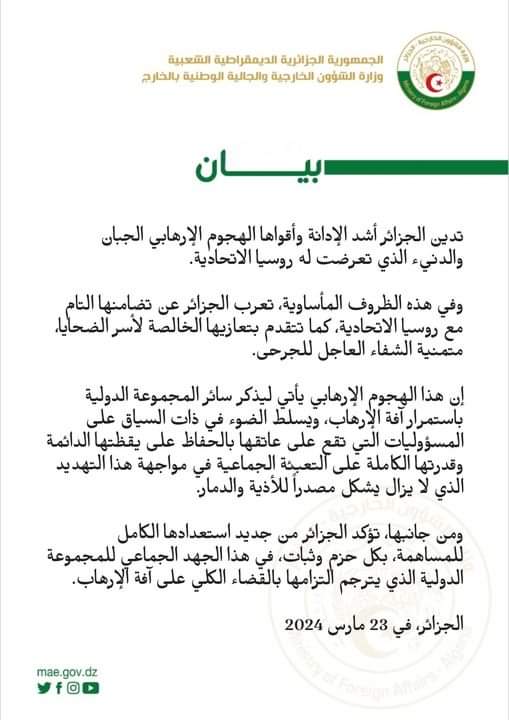 وجاء في بيان لوزارة لخارجية: “في هذه الظروف المأساوية تعرب الجزائر عن تضامنها التام مع روسيا الاتحادية، كما تتقدم بتعازيها الخالصة لأسر الضحايا، متمنية الشفاء العاجل للجرحى”.