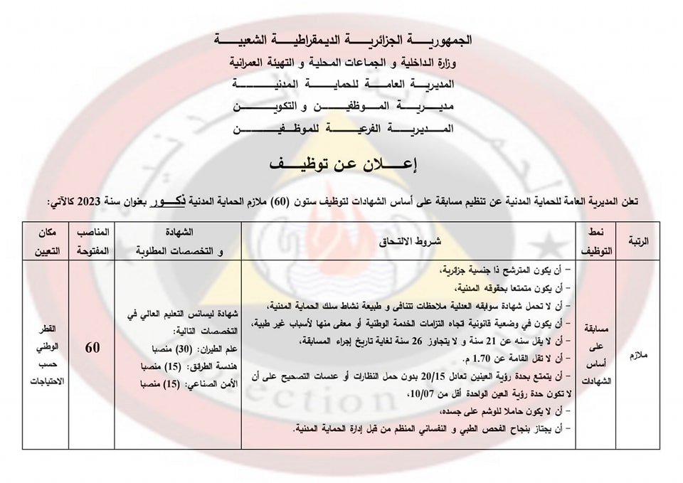 أعلنت، صبيحة اليوم الثلاثاء، المديرية العامة للحماية المدنية عن تنظيم مسابقة على أساس الشهادات لتوظيف (120) ضابط للحماية المدنية على المستوى الوطني بعنوان سنة 2023، منها 60 ملازم أول للحماية المدنية ذكور و60 ملازم للحماية المدنية ذكور.