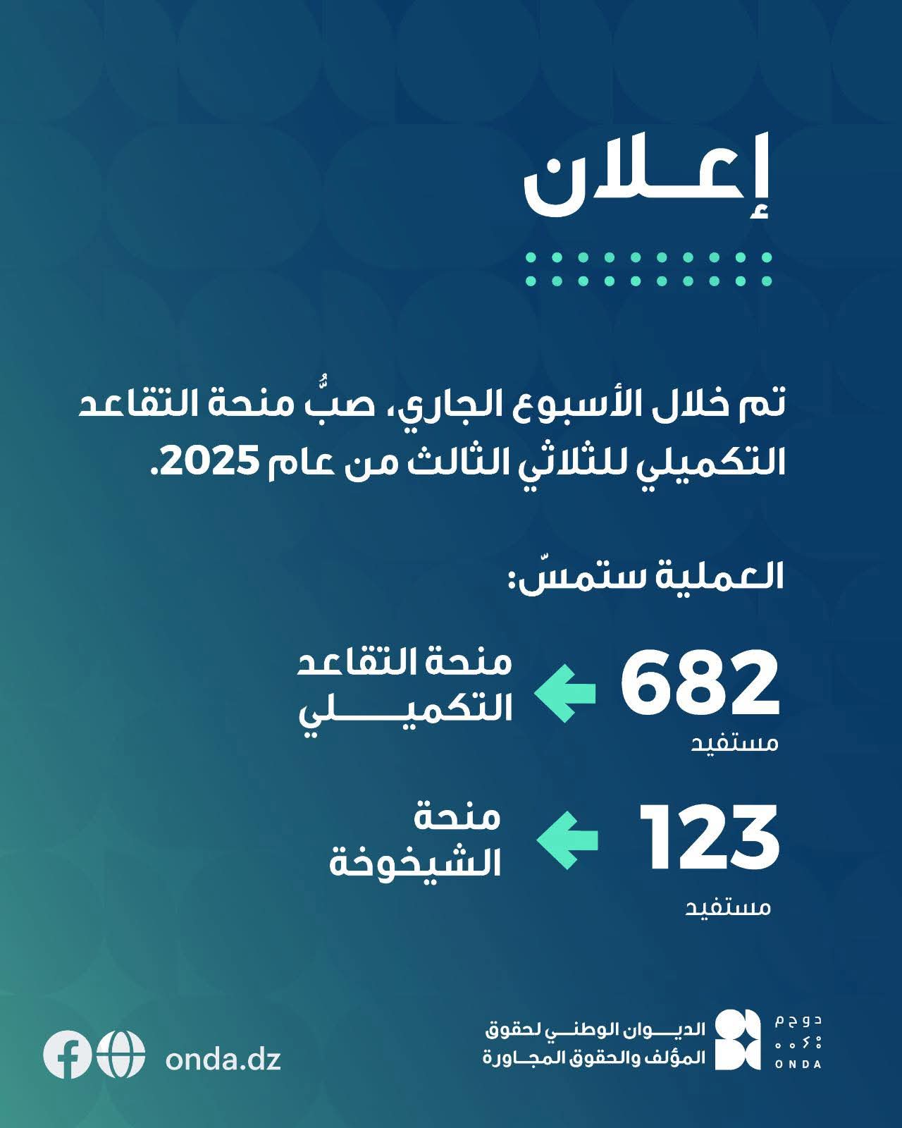 الديوان الوطني لحقوق المؤلف والحقوق المُجاورة يُعلن عن صبّ منحتي التقاعد التكميلي والشيخوخة