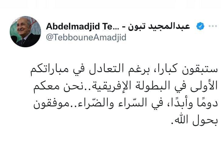 الرئيس تبون ينشر تغريدة على حسابه تويتر، لتشجيع المنتخب الوطني، جاء فيها: