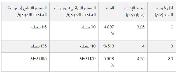 يبلغ أجل الاستحقاق لتلك السندات 6 و10 و30 عاماً، وجرى تخفيض العائد النهائي عليها مقارنة بالسعر الاسترشادي الأولي، وفق بيانات التسعير النهائي للطرح التي أوردتها بلومبرغ.