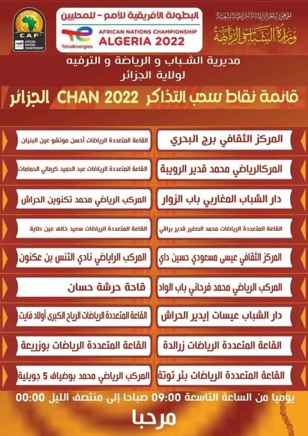أعلنت مديرية الشباب والرياضة والترفيه لولاية الجزائر ، عن نقاط سحب تذاكر مواجهات بطولة أمم إفريقيا للمحليين التي ستنطلق بداية من الثالث عشر جانفي وإلى غاية الرابع من فيفري.