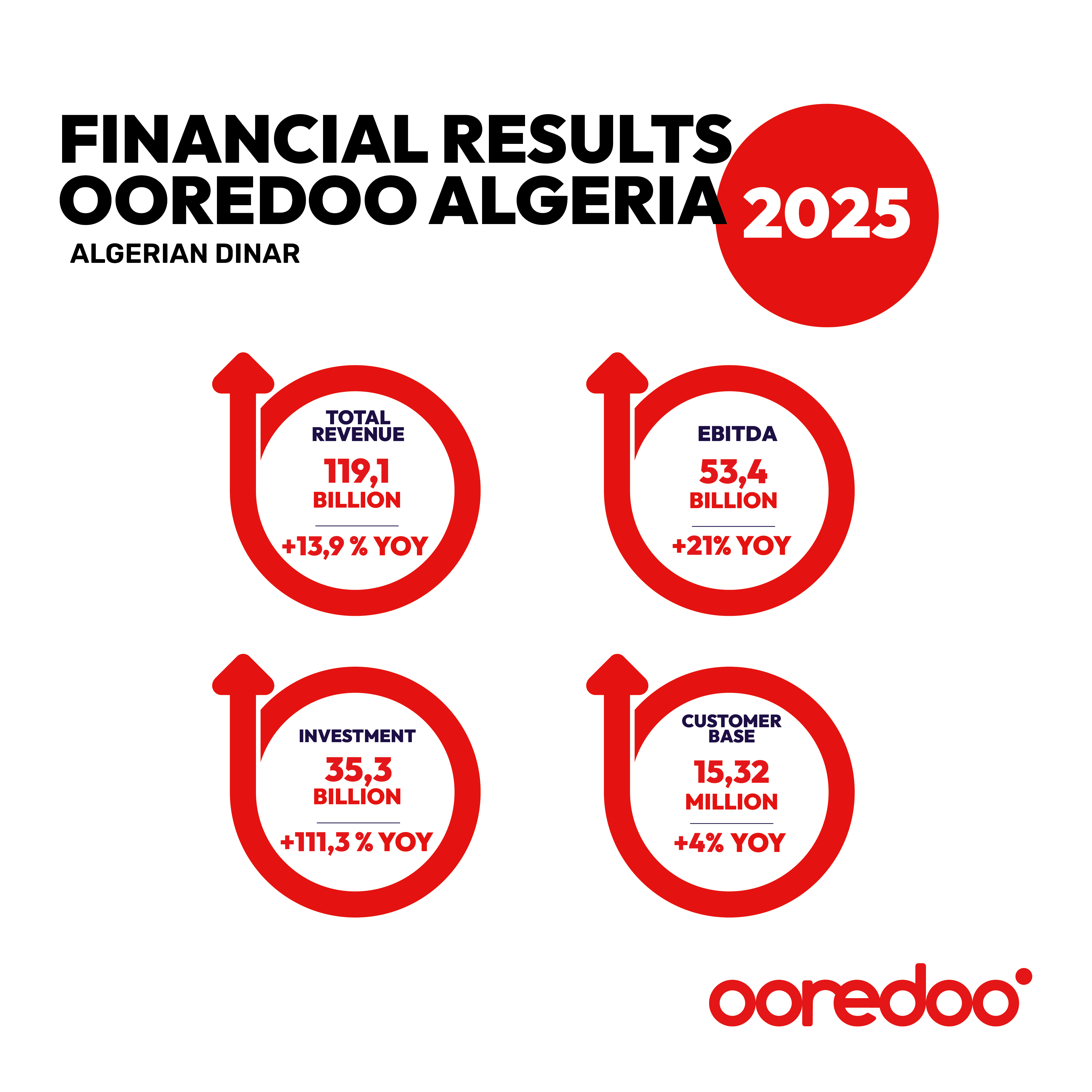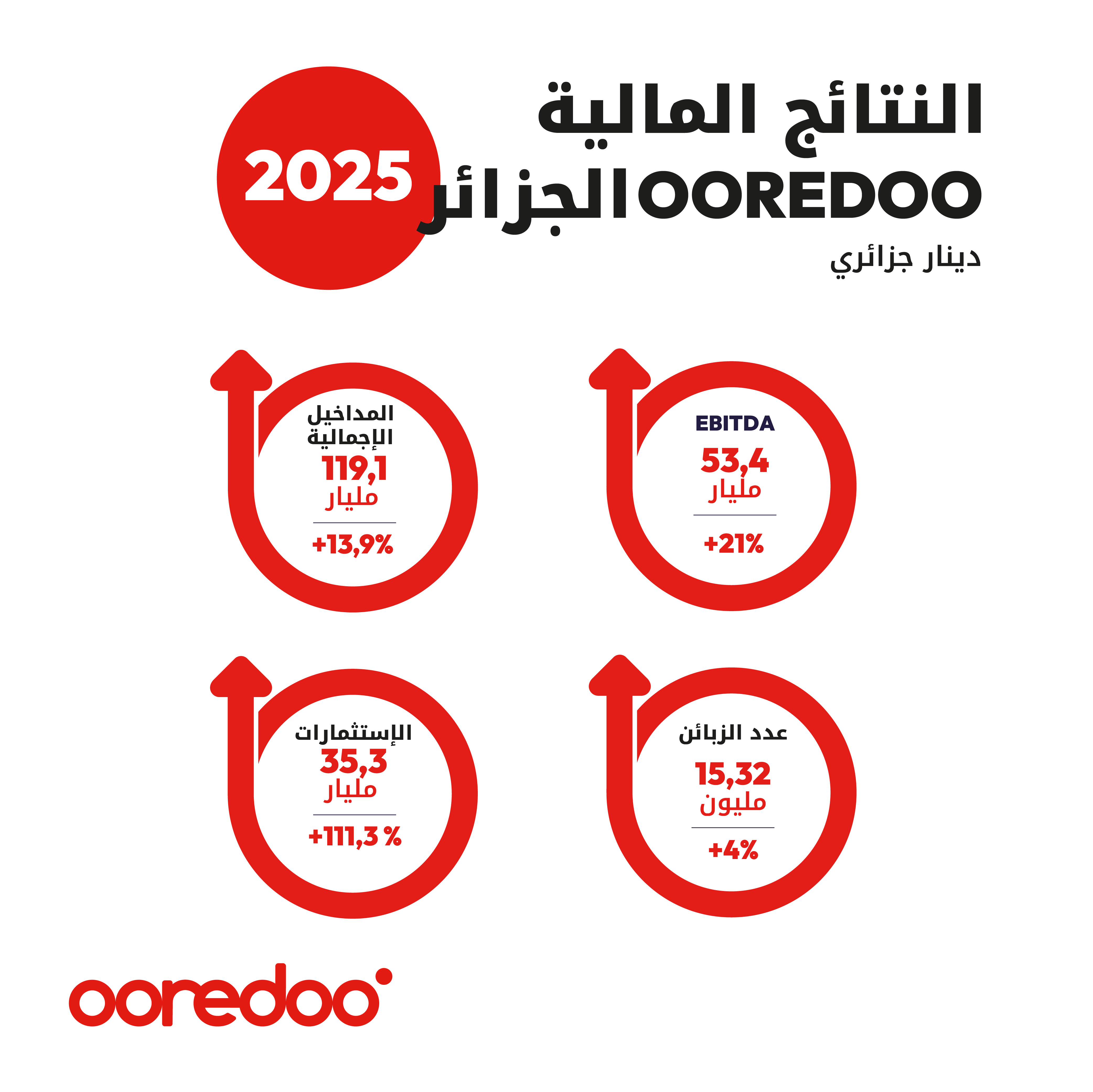 ومع نهاية ديسمبر 2025، بلغ عدد مشتركي Ooredoo الجزائر 15،32 مليون مشترك مقارنة ب 14،73 مليون مشترك للفترة نفسها من عام 2024، وهو ما يمثل زيادة بنسبة %4، ما يجمّد الثقة المتجددة لزبائنها ويؤكّد مكانتها كفاعل مرجعي في تمكين استخدامات الجيل الخامس وتعزيز تبين في الجزائر .
