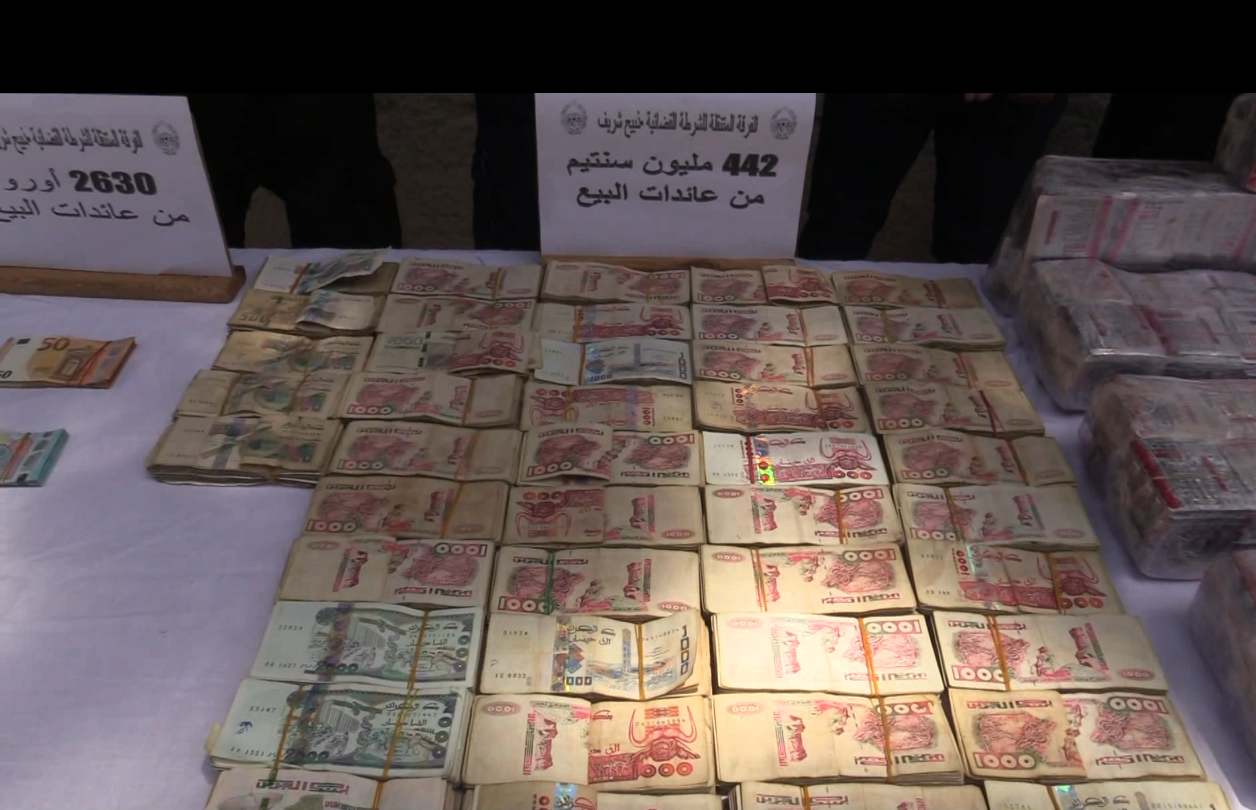 بالإضافة إلى مبلغ مالي بالعملة الوطنية يقدر بـ 442 مليون سنتيم و 2630 أورو من عائدات الترويج، مع حجز (02) مركبتين كانتا تستعملان في ترويج السموم.
