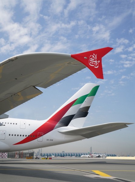 وسوف يلاحظ محبو متابعة الطائرات على الفور التغييرات في زعنفة الذيل وطرفي الجناحين. ففي التصميم الجديد، يظهر علم دولة الإمارات على زعنفة ذيل الطائرة بصورة أكثر ديناميكية وانسيابية كعمل فني ثلاثي الأبعاد، كما تم طلاء طرفي الجناحين باللون الأحمر مع ظهور شعار الإمارات بالخط العربي باللون الأبيض. وسوف يتسنى للركاب على متن الطائرة، بإطلالة من النافذة، مشاهدة ألوان علم الإمارات مرسومة على طرف الجناح المواجه لقمرة القيادة.