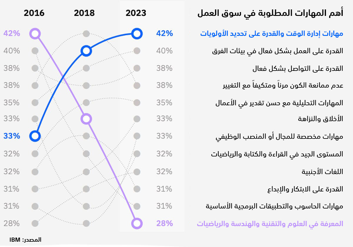 سيؤدي هذا إلى تغيير طبيعة المهارات التي كانت الشركات تبحث عنها في موظفيها في السابق. فالمعرفة والكفاءة في مجالات العلوم والتكنولوجيا والهندسة والرياضيات، والتي كانت المهارات الأكثر أهمية في عام 2016، ستقل أهميتها في عام 2023. ويعزو التقرير ذلك إلى أن أدوات الذكاء الاصطناعي مثل ChatGPT تتيح الآن للأشخاص القيام بالمزيد من المزاد بمعرفة أقل.