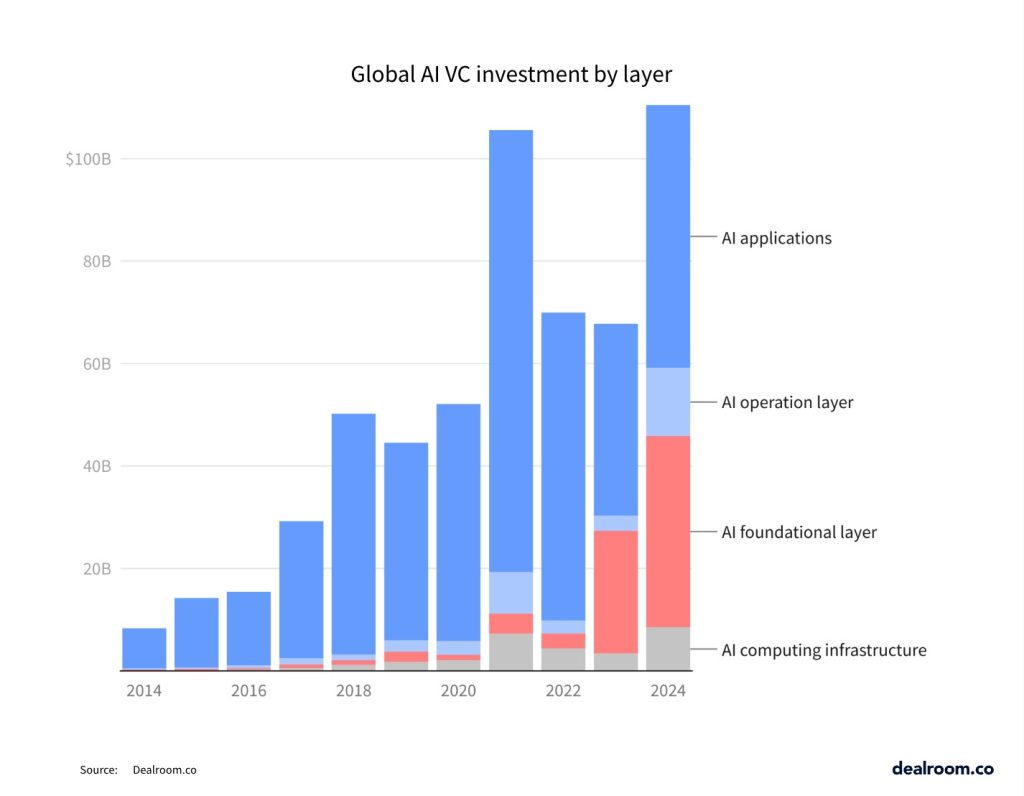 بتفصيل أكثر، يهيمن مجالا النماذج الأساسية والذكاء الاصطناعي التوليدي على تفضيلات رأس المال المغامر، إذ تمكنت الشركات المتخصصة في الذكاء الاصطناعي التوليدي من جمع 47.4 مليار دولار خلال 2024، بينما سجلت تقنيات النماذج الأساسية نمواً متسارعاً تجاوز التطبيقات المعتمدة على الذكاء الاصطناعي خلال العامين الماضيين.