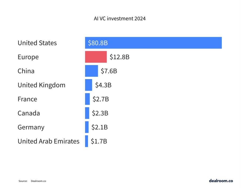 تكشف بيانات Dealroom عن التوزيع غير المتكافئ لتمويلات الذكاء الاصطناعي خارج السوق الأمريكية، مما يؤكد الفجوة الكبيرة في هذا المجال. فقد استحوذت شركات الذكاء الاصطناعي الناشئة على 42% من إجمالي استثمارات رأس المال المغامر في الولايات المتحدة خلال العام الماضي، أي ما يعادل 80.7 مليار دولار. وفي المقابل، لم تتجاوز حصة أوروبا 25% (12.8 مليار دولار)، بينما بلغ نصيب بقية دول العالم 18% فقط. أما الصين، فقد كانت استثناء ملحوظاً باستثمارات بلغت 7.6 مليارات دولار.