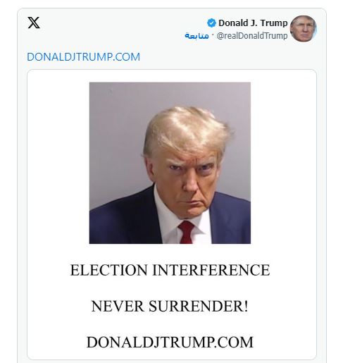 وفي أول منشور له منذ عام 2021، عرض ترمب الصورة المأخوذة له من سجن مقاطعة فولتون، إلى جانب عبارة: “التدخل في الانتخابات لا يستسلم أبداً!”. ورابط صفحة جمع التبرعات لحملته الرئاسية.