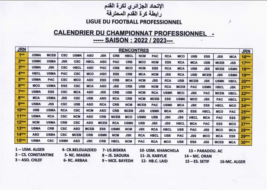 كشفت الرابطة المحترفة لكرة القدم عن رزنامة مباريات الجولة الأولى من المحترف الأول لموسم 2023/2022.