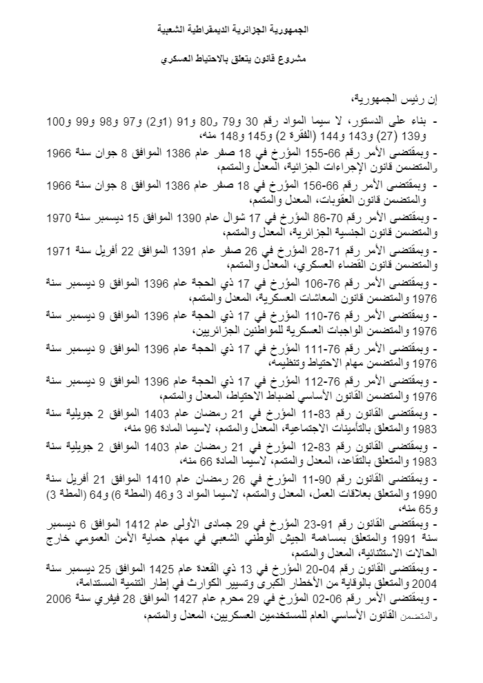 وتفيد المادة الخامسة من المشروع أنه يستثنى من الادراج في الاحتياط العسكريون العاملون والعسكريون المتعاقدون المشطوبون من صفوف الجيش الوطني الشعبي حسب الحالات المنصوص عليها في القانون الأساسي العام للمستخدمين العسكريين، بالإضافة إلى العسكريين العاملين والمتعاقدين الذين تم إنهاء خدمتهم بصفة نهائية في صفوف الجيش الزوطني الشعبي بسبب طبي بالنسبة للمعترف بعجزهم النهائي عن أداء الخدمة في الجيش ضمن الشروط المحددة في تنظيم المعمول به الذي يحكم التأهيل الطبي للخدمة في الجيش.