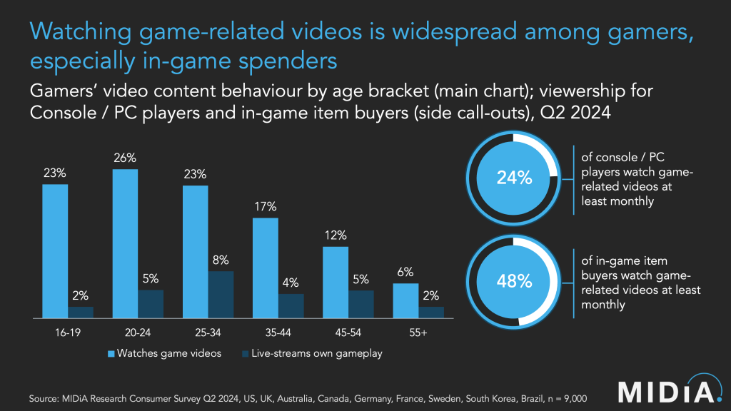 كما وأوضحت شركة Midia أن النتائج تسلط الضوء على الإمكانيات غير المستغلة التي يمكن أن يستفيد منها ناشرو الألعاب لإدماج محتوى الفيديو داخل منظوماتهم الخاصة. وأشار التقرير إلى أن 24% من لاعبين عبر المنصات والأجهزة المنزلية وأجهزة الحواسيب، و48% من مشتري المحتوى داخل الألعاب، يشاهدون مقاطع الفيديو المتعلقة بالألعاب مرة واحدة شهرياً على الأقل، مع اعتبار الفئة الأخيرة من اللاعبين ذوي الإنفاق المرتفع.