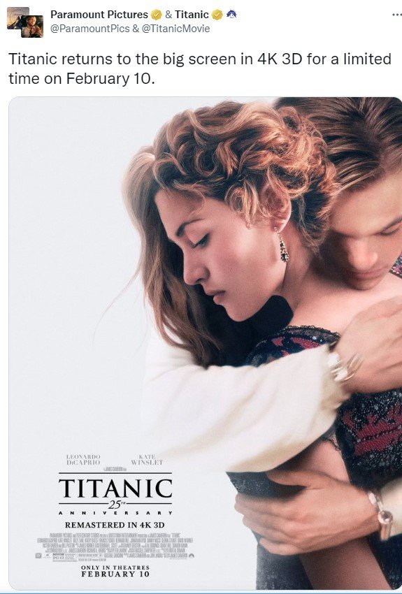 وقد نشر حساب “Paramount Picture & Titanic” على تويتر البوستر الرسمي للفيلم. وكتب ” يعود Titanic إلى الشاشة الكبيرة بدقة 4K 3D لفترة محدودة في 10 فيفري”.