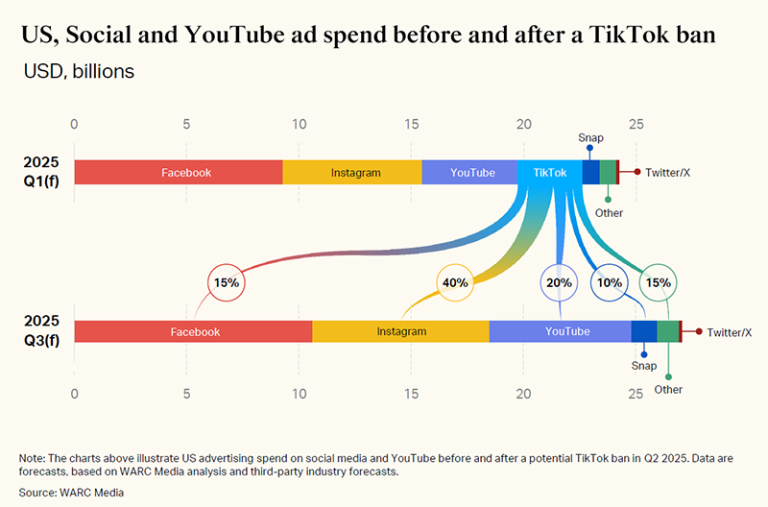 في حال فرض حظر على تيك توك في الولايات المتحدة، ستكون يوتيوب وإنستغرام وسناب شات أبرز المستفيدين في سوق الإعلانات الرقمية. وستكون حصة تقدر بنحو 12 مليار دولار من الإنفاق الإعلاني على المحك، مما يضع العديد من العلامات التجارية في موقف غير مستقر بشأن مستقبلها على المنصة.