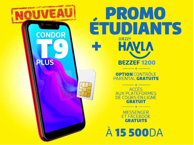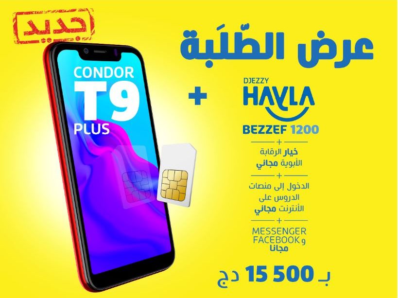 تتكون الباقة الاولى من هاتف ذكي ” كوندور تي 9 +” ، و شريحة الكترونية مزودة بعرض هايلة بزاف 1200 صالحة لمدة شهر كامل. أضف إلى ذلك أن خدمة “الرقابة الأبوية” المقدمة مجانًا. الباقة متوفرة بسعر استثنائي 15.500 دينار جزائري تشمل الضرائب و الرسوم.