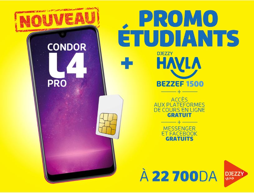 وهذا ليس كل شيء! بل سيستفيد التلاميذ و الطلاب الذين يقتنون هذه الباقات من إمكانية الدخول المجاني الى منصة الدروس عبر الإنترنت www.djezzy.dz/cours-en-ligne وسيتمكنون أيضًا من البقاء على اتصال والتفاعل مجانًا على فيسبوك و ميسنجر.