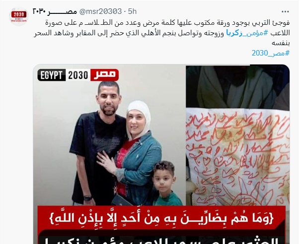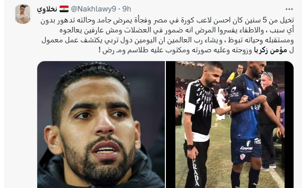 تصدر نجم الأهلي المصري مؤمن زكريا “الترند” في مصر بمواقع التواصل الاجتماعي بعد اكتشاف أعمال سحر في إحدى مقابر القاهرة ضده وضد زوجته، وهو السحر الذي تسبب في مرض غريب للاعب.