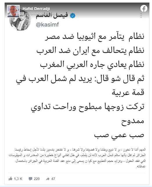 رد المعلق الرياضي الجزائري في قنوات بين سبورتس، حفيظ دراجي، على تطاول الإعلامي بقناة الجزيرة القطرية، فيصل القاسم، الذي تهجم على الجزائر وسياستها الخارجية.