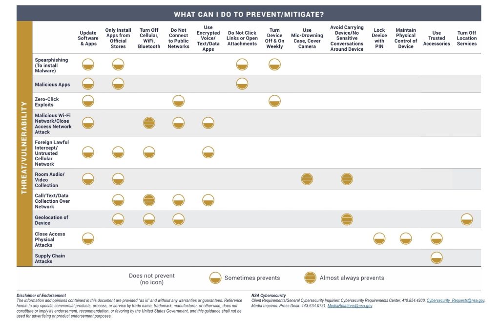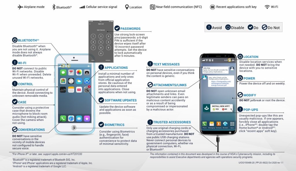 توصي وكالة الأمن القومي الأمريكية بعدد من الإجراءات الأخرى لضمان مستوى أفضل من الحماية والأمان في الأجهزة المحمولة، مثل المداومة على تحديث التطبيقات، والاعتماد على المصادر الرسمية والمشروعة.