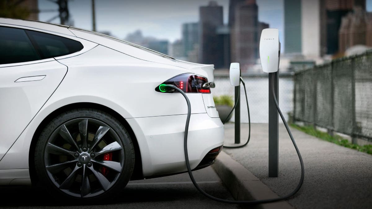 A Tesla vehicle is shown charging at a Tesla Supercharger site in Charlotte, N.C., Friday, July 19, 2019. (AP Photo/Chuck Burton)