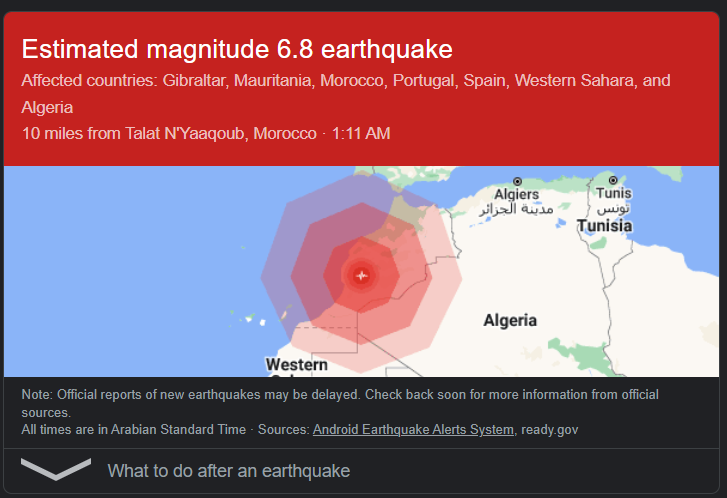 كما قال موقع “اليوم 24” (مستقل) إن الزلزال تسبب في انهيار أبنية سكنية في مدينة مراكش، بينها صومعة أحد مساجد المدينة.