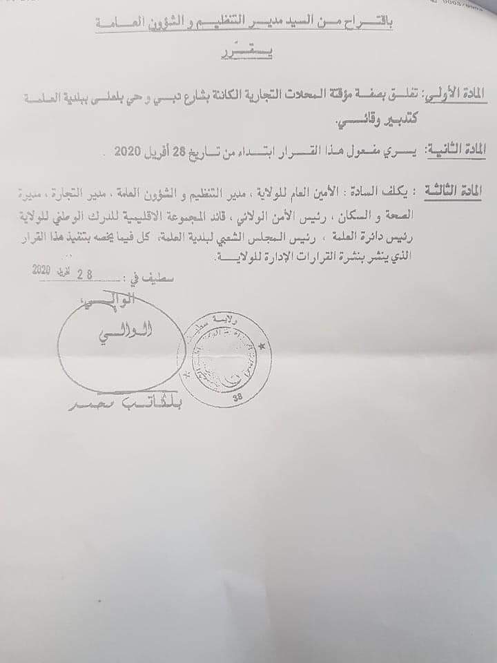 أصدرت مصالح ولاية سطيف قرار يقضي بغلق المحلات التجارية الكائنة بشارع دبي وحي بلعلى ببلدية العلمة مؤقتا كإجراء وقائي.