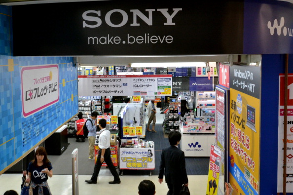 A logo of Japanese electronics giant Sony is displayed at a shop in Tokyo on May 13, 2014. Struggling electronics giant Sony will not pay bonuses to senior executives for the third straight year, the Japanese company said on May 13, as it braces for another disastrous earnings showing. AFP PHOTO / Yoshikazu TSUNO (Photo credit should read YOSHIKAZU TSUNO/AFP via Getty Images)