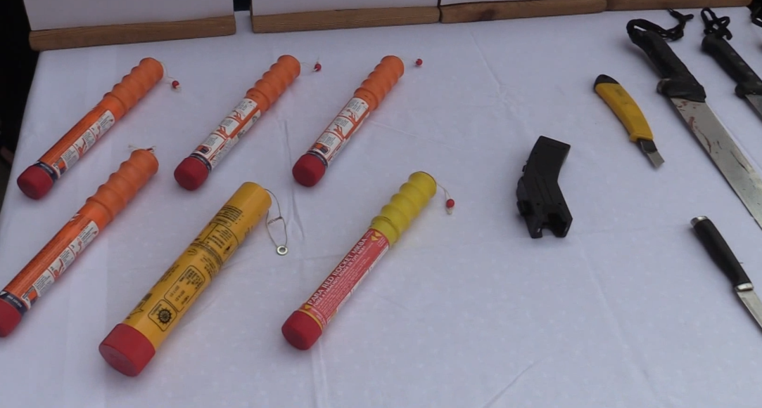 وبفضل التدخل السريع لعناصر الشرطة، تم توقيف المشتبه فيهم الثلاثة وحجز ترسانة من الأسلحة البيضاء مختلفة الأحجام، من بينها:
