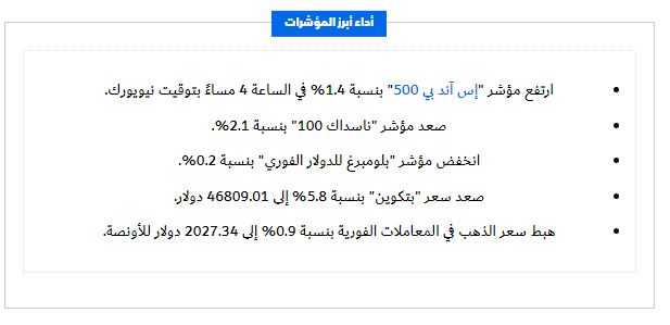 - مؤشر “ناسداك 100″ يرتفع 2.1% و”إس آند بي 500” يزيد 1.4% خلال أول جلسة في الأسبوع