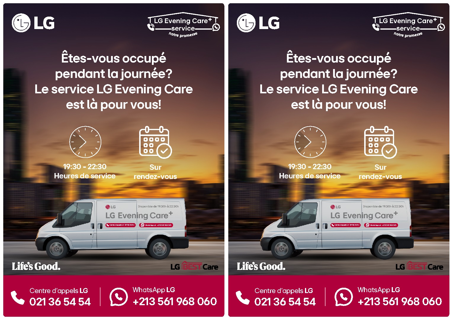 من خلال “+LG Evening Care”، تؤكد “إل جي” التزامها بتقديم خدمة متميزة والتقرب من العملاء. تضمن هذه الخدمة المتميزة الدعم السريع والفعال لأجهزة “إل جي”، مباشرة في المنزل، مع خبرة الأعوان التقنيين المؤهلين وضمان التشخيص الدقيق. كما تشمل التدخلات أعمال الصيانة والإصلاح والنصائح للاستخدام الأمثل لمنتجات “إل جي”.