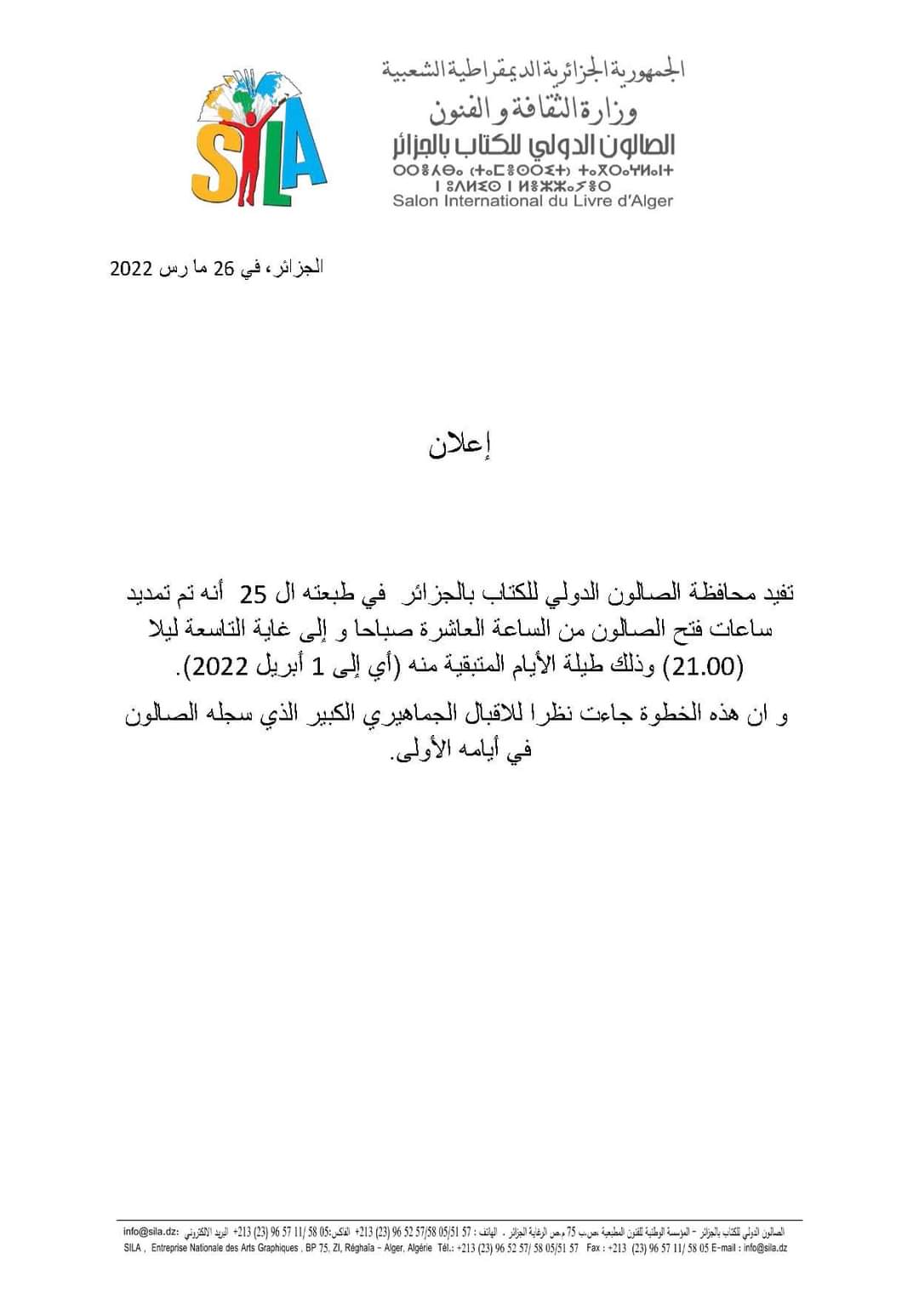 قررت محافظة الصالون الدولي للكتاب بالجزائر تمديد ساعات الفاتح إلى التاسعة ليلا.