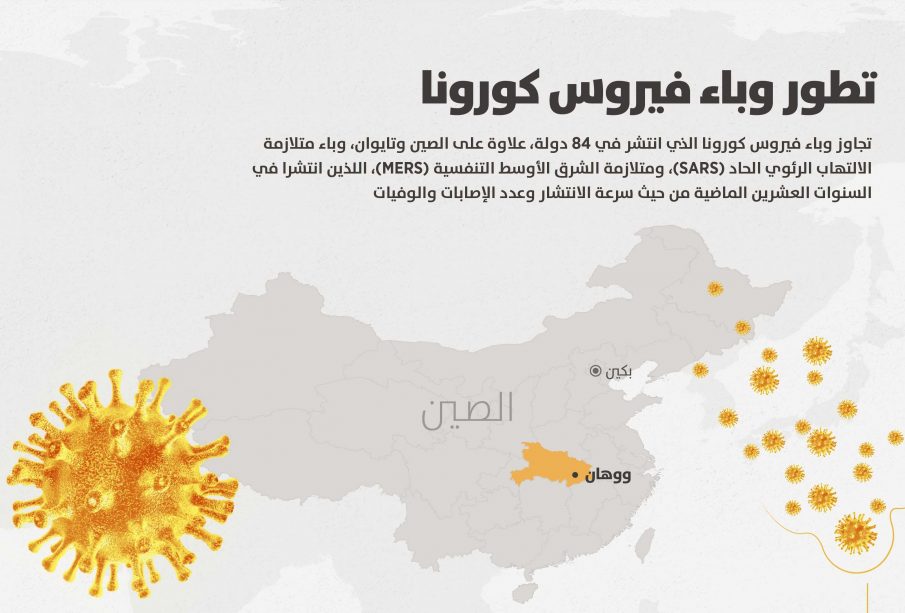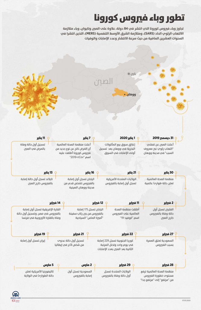 تجاوز انتشار فيروس كورونا القاتل كل التوقعات وهو منتشر إلى اليوم في 84، في الوقت الذي لا تزال فيه الصين مصدر الوباء الرقم واحد من حيث عدد الإصابات تليها إيطاليا وإيران وفرنسا. هذا الغرافيك يوضح خريطة انتشار الفيروس بالأرقام والمعطيات الجديدة.