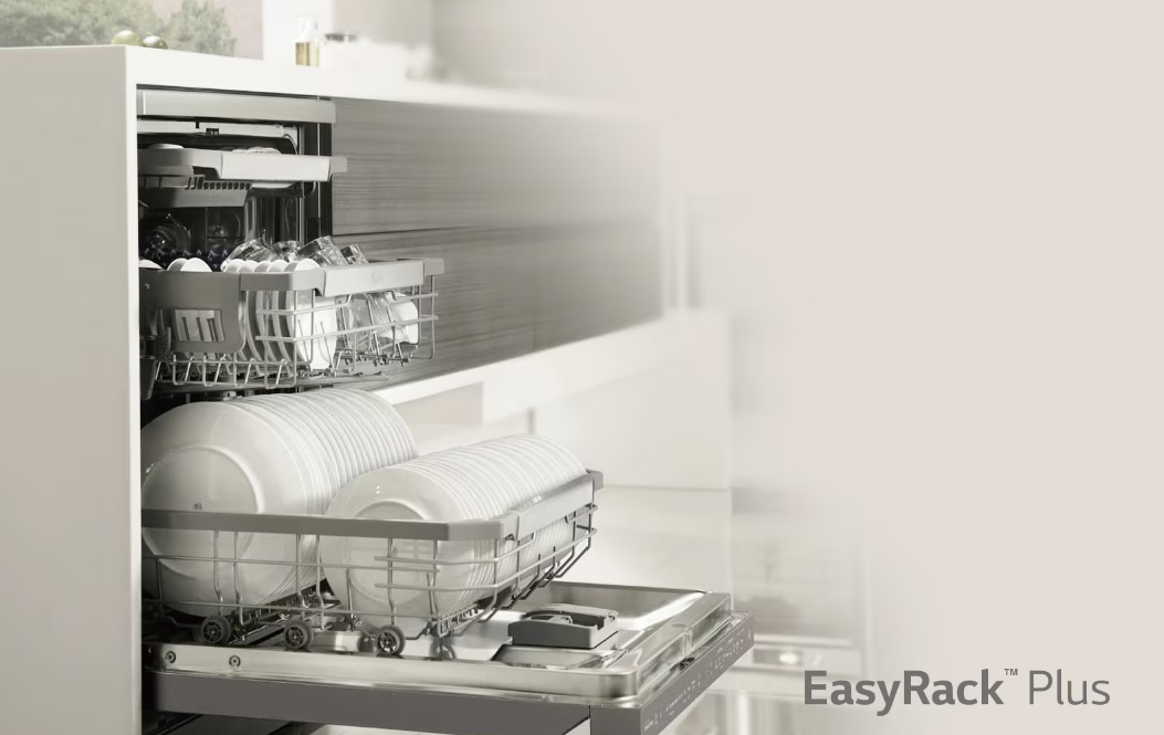 توفر غسالة الأطباق LG QuadWash™ حلول تحميل مرنة تناسب جميع احتياجاتكم.كما يتيح نظام EasyRack™ Plus ضبط ارتفاع الرف العلوي بسهولة على ثلاثة مستويات، ما يوفر مساحة إضافية للعناصر كبيرة الحجم مثل الأواني وأكواب الإسبريسو. هذا وتقدم الأرفف القابلة للطي مرونة كبيرة لتخزين الأطباق، والأوعية، والمقالي.
