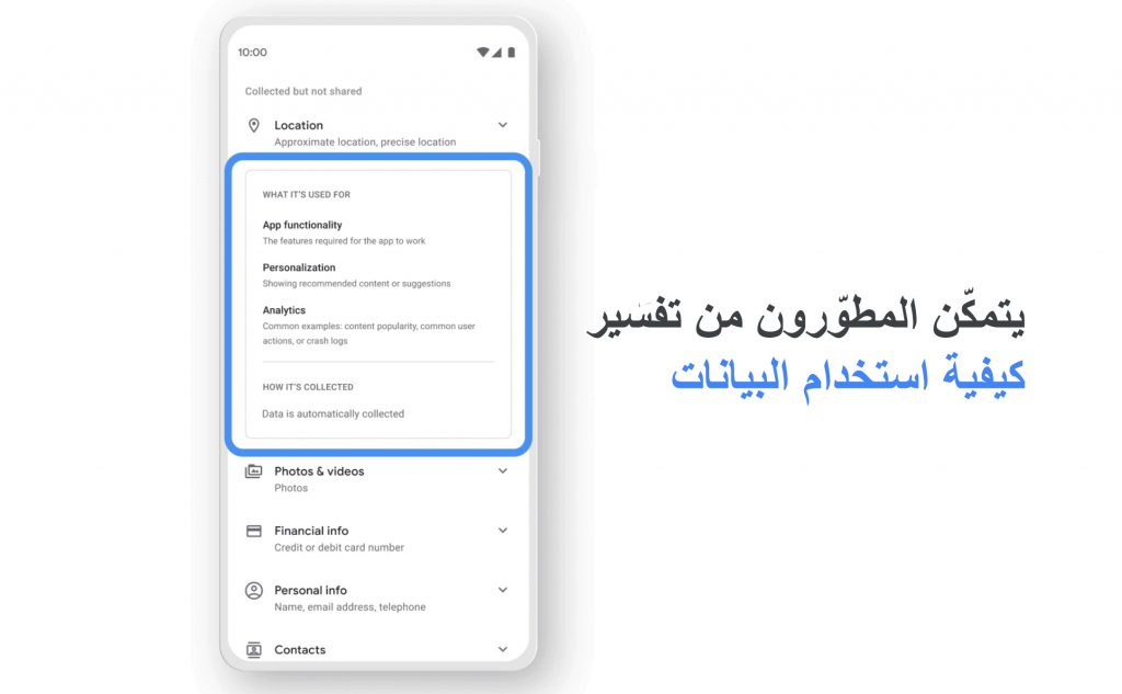 تقول غوغل إنه سيظهر في بطاقة بيانات المتجر الخاصة بالتطبيق ملخصًا جديدًا يحوي شرح للمطور عن نوع البيانات التي يجمعها أو يشاركها التطبيق، مع تسليط الضوء على تفاصيل تتعلّق بالأمان، مثلاً ما إذا كان التطبيق: