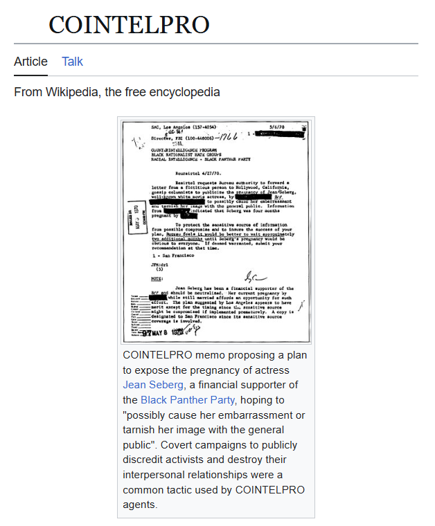 الوثيقة تحدثت عن مشروع تحت قيادة إدغار هوفر، عُرف باسم (COINTELPRO) تجسس سريًا على المواطنين الأمريكيين والشخصيات الكبيرة.