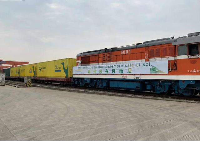 ويحمل قطار المساعدات الصيني لافتة كتب عليها باللغة الإسبانية :”بعد العاصفة ، تشرق الشمس دائما”.
